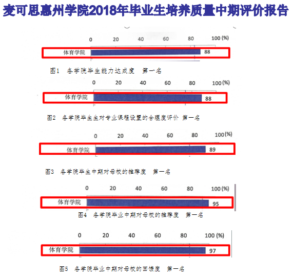 从毕业生中长期跟踪发展调查来看,多数毕业生在毕业后的五年内成为单位的骨干。根据麦可思对惠州学院2018年毕业生培养质量中期评价的报告显示,体育学院毕业生的能力达成度、对专业课程设置的合理评价、对母校的推荐度、关注度和回馈度居学校首位。