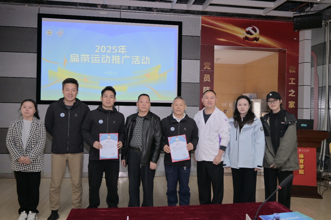 为更好的推广扁带运动,体育学院党委书记赖常青为翁家银教授,卢安敏老师颁发聘书,聘请为惠州学院体育学院“高级扁带教练”。