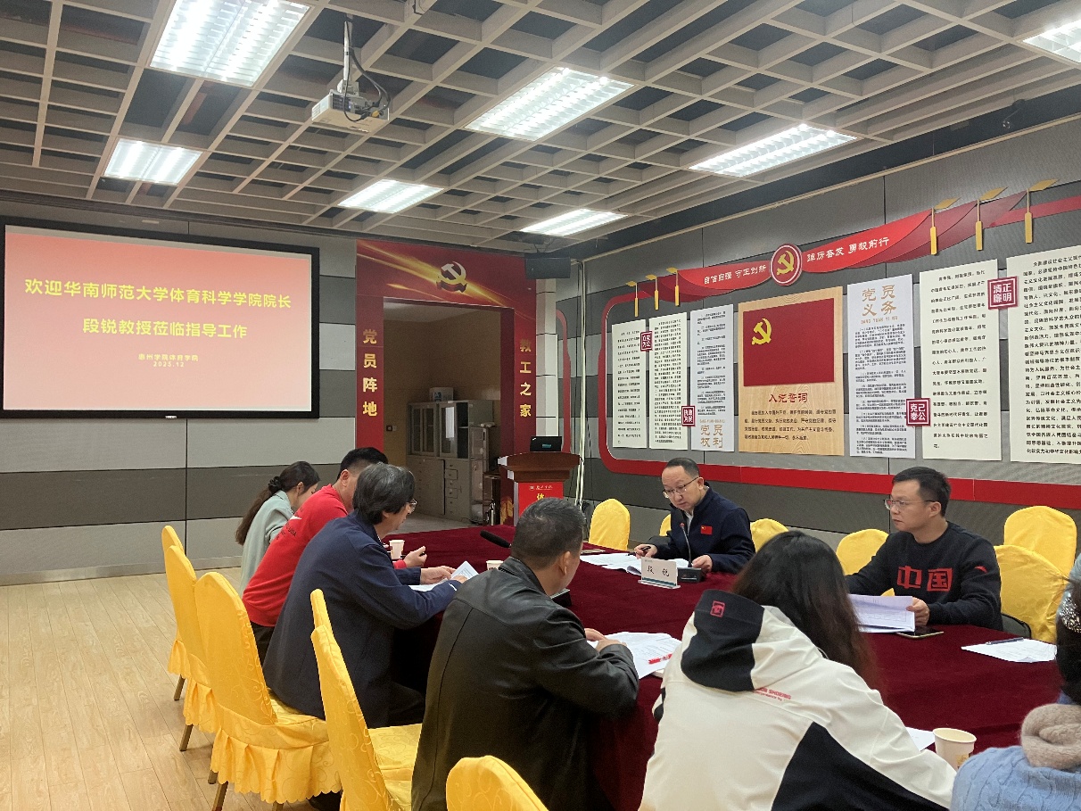 指导座谈会由体育学院院长张宗国主持。他首先对段锐教授的莅临表示热烈欢迎,并围绕体育硕士专业学位点的建设基础、师资结构、人才培养特色与未来规划作了细致讲解。惠州学院科学技术部王萌博士传达了学校对申硕工作的重视与支持。